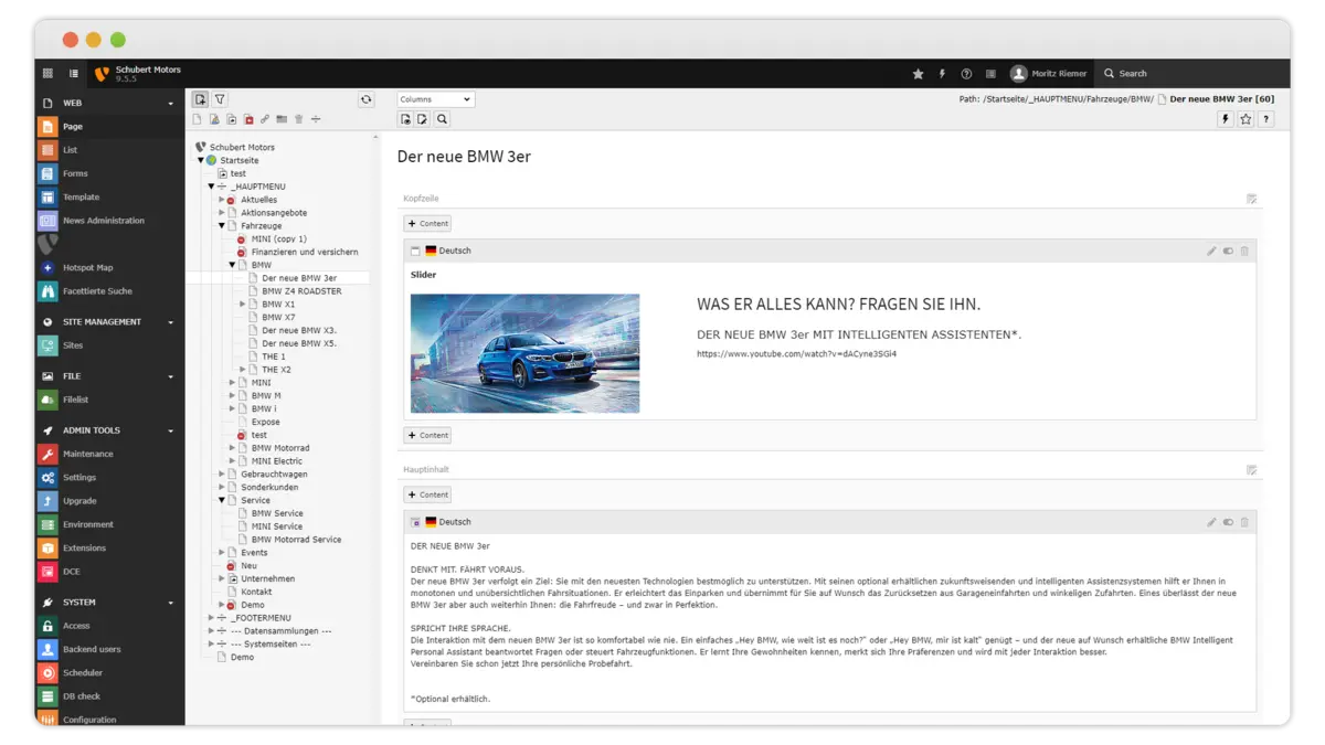 Im Backend findet der Redakteur eine Liste aller Module, den Strukturbaum der Seite und den Inhaltsbereich, in dem Änderungen und Ergänzungen eingepflegt werden. Die Oberfläche des TYPO3-Backends ist ansprechend gestaltet. Icons und Farbflächen lassen den Benutzer leicht durchnavigieren. Ein Entwickler legt fest, welche Bereiche von einem Redakteur veränderbar sind. Damit stellen wir sicher, dass jeder Benutzer nur dort Änderungen vornehmen kann, wo er es darf. Für jeden Benutzer können eigene Lese- und Schreibrechte definiert werden. Das ist insbesondere dann spannend, wenn Ihr Unternehmen beispielsweise über mehrere Standorte oder Abteilungen verfügt, die unabhängig voneinander die Inhalte Ihrer Webseiten pflegen. Das von uns als Digitalagentur entwickelte Webdesign wird dabei nicht durch versehentliche Klicks verändert.